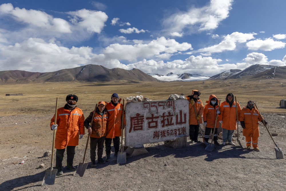 記者一行到達唐古拉山口時,7名身穿橙色制服的養(yǎng)路工人,正在用鐵鍬修補路肩。盡管太陽高懸,風速卻不小,用來警示隔離的錐形交通路標不斷被大風吹倒,工人們不時要把它們扶正。
