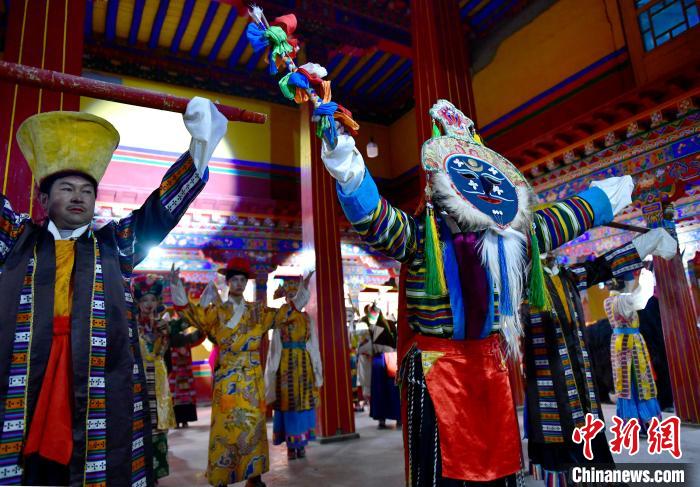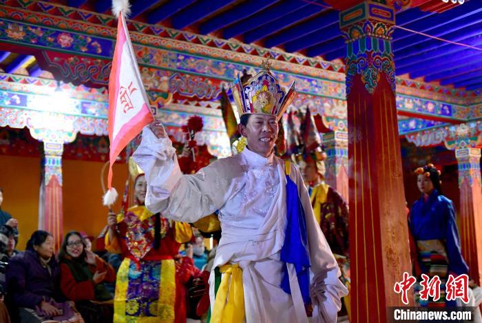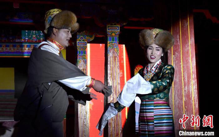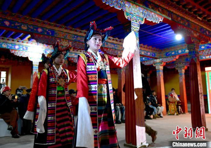 1月2日晚,一場視聽結(jié)合、感官沉浸的拉薩傳統(tǒng)演藝服飾秀在西藏自治區(qū)拉薩市喜德林古建大院上演。囊瑪堆諧、覺木隆藏戲等非遺的演繹,讓觀眾領(lǐng)略到拉薩深厚的文化底蘊(yùn)。圖為拉薩傳統(tǒng)演藝服飾秀演出現(xiàn)場。中新社記者 李林 攝