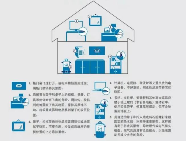 在日常生活、學(xué)習(xí)、工作中,要會(huì)識(shí)別和分析家中及辦公環(huán)境的地震災(zāi)害風(fēng)險(xiǎn)隱患,尤其是那些容易傾倒的大型家具、容易砸到人的懸掛物、發(fā)生位移容易損壞的燃?xì)夤艿篮碗娋€等裝置以及在上班、上學(xué)途中的巨大的廣告牌和玻璃幕墻。