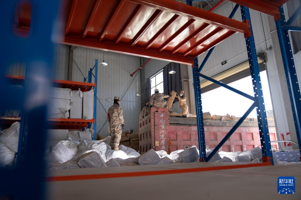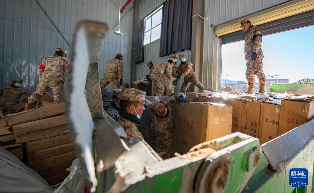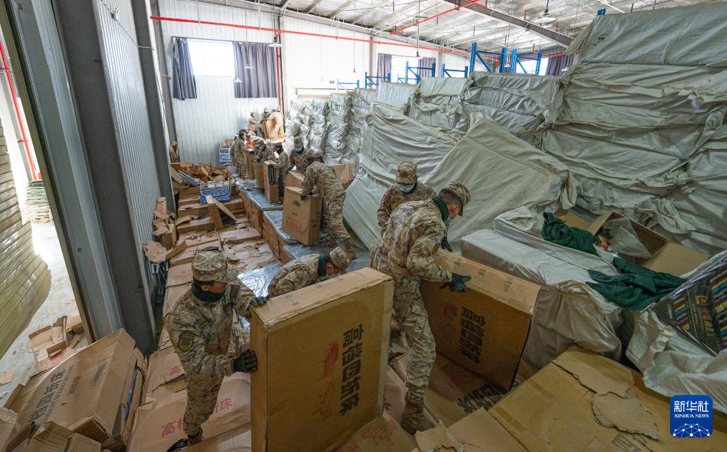 1月8日,在日喀則市經(jīng)開區(qū)物資儲備倉庫,武警官兵在搬運(yùn)抗震救災(zāi)物資。新華社記者 丁增尼達(dá) 攝