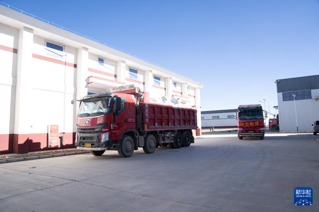 1月8日,在日喀則市經(jīng)開區(qū)物資儲備倉庫,裝好抗震救災(zāi)物資的車輛駛出園區(qū)。新華社記者 丁增尼達(dá) 攝