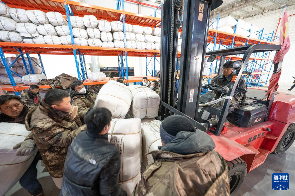 1月8日,在日喀則市經(jīng)開區(qū)物資儲備倉庫,當(dāng)?shù)馗刹咳罕娫诎徇\(yùn)抗震救災(zāi)物資。新華社記者 丁增尼達(dá) 攝