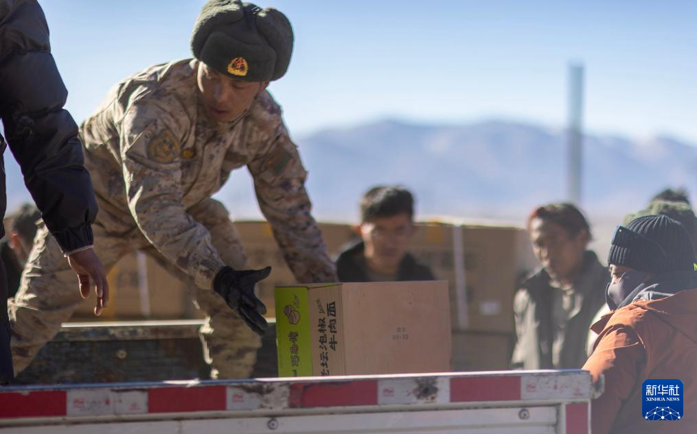 1月8日,解放軍戰(zhàn)士在尼轄鄉(xiāng)雪龍村幫助受災(zāi)群眾搬運生活物資。新華社記者 姜帆 攝