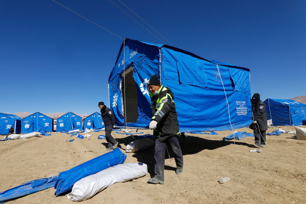 2025年1月8日,在日喀則市定日縣措果鄉(xiāng)雪珠村安置點,救援人員幫助受災(zāi)群眾搭建帳篷。新華社記者 沈伯韓 攝