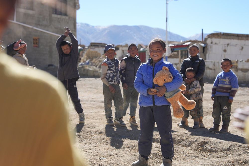 2025年1月8日,在日喀則市定日縣措果鄉(xiāng)塘仁村地震災(zāi)后安置點,工作人員向孩子們贈送玩偶熊,并給他們表演節(jié)目。新華社記者 晉美多吉 攝