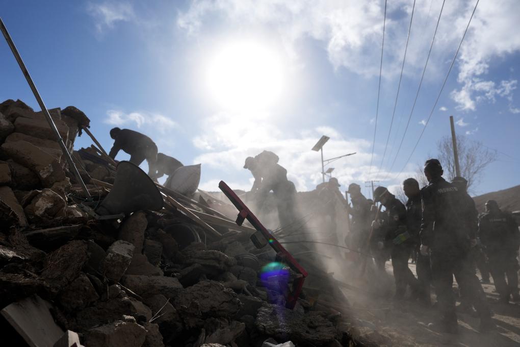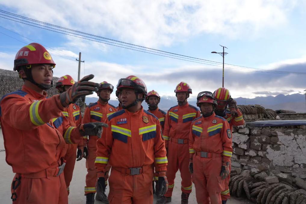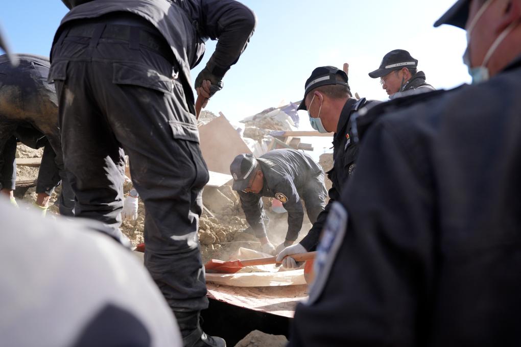 1月7日,救援人員在定日縣長所鄉(xiāng)古榮村進(jìn)行搜救。