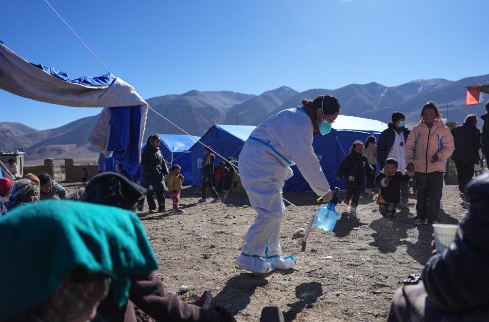 1月8日,在定日縣措果鄉(xiāng)野江村安置點(diǎn),醫(yī)護(hù)人員進(jìn)行消殺。