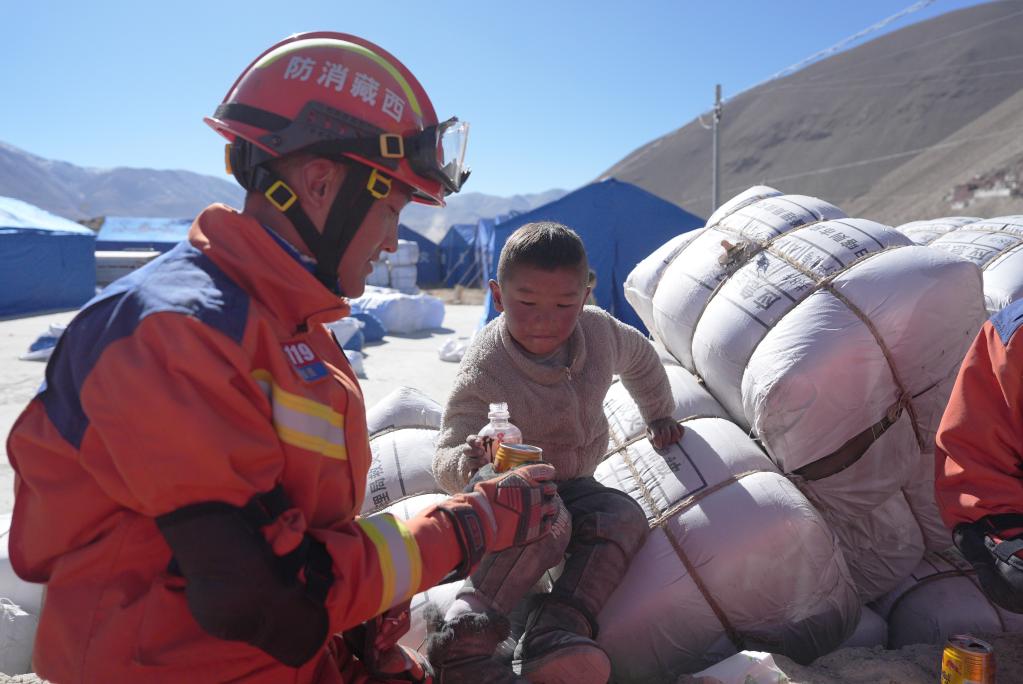 1月8日,在塘仁村安置點(diǎn),消防救援人員和小朋友互動(dòng)。