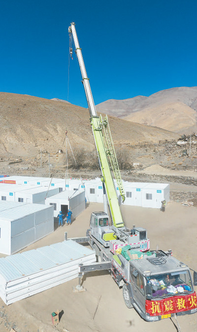 1月9日,在定日縣長所鄉(xiāng)古榮村安置點(diǎn),施工人員抓緊搭建移動板房。人民網(wǎng)記者 翁奇羽攝