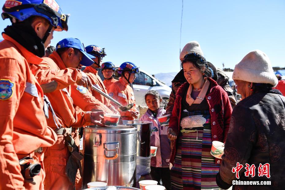 1月9日,西藏自治區(qū)定日縣曲洛鄉(xiāng)措昂村安置點(diǎn),西藏自治區(qū)森林消防總隊(duì)救援人員為受災(zāi)民眾提供飲食。當(dāng)日,位于西藏自治區(qū)定日縣曲洛鄉(xiāng)措昂村安置點(diǎn),西藏各級救援人員和愛心企業(yè)不斷轉(zhuǎn)運(yùn)、發(fā)放生活物資、搭建活動板房、全力保障受災(zāi)民眾的飲食供應(yīng)等,保障受災(zāi)民眾基本生活。中新社記者 貢嘎來松 攝