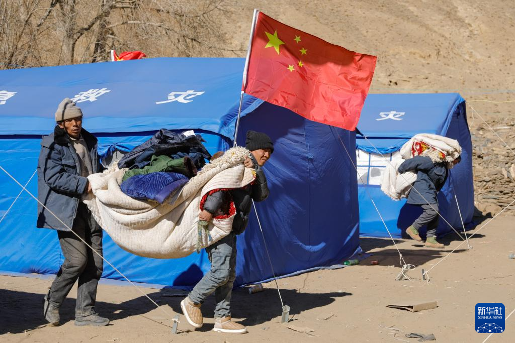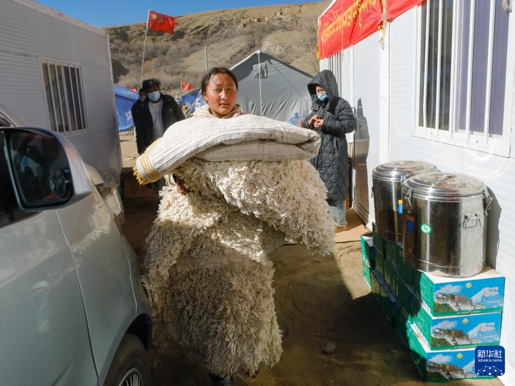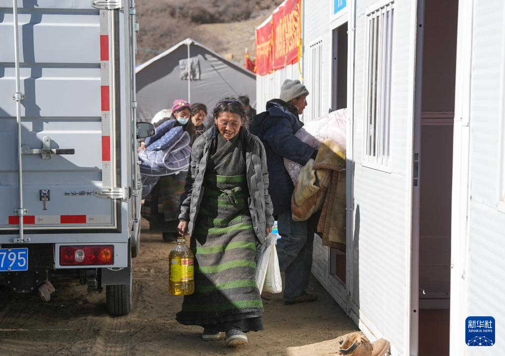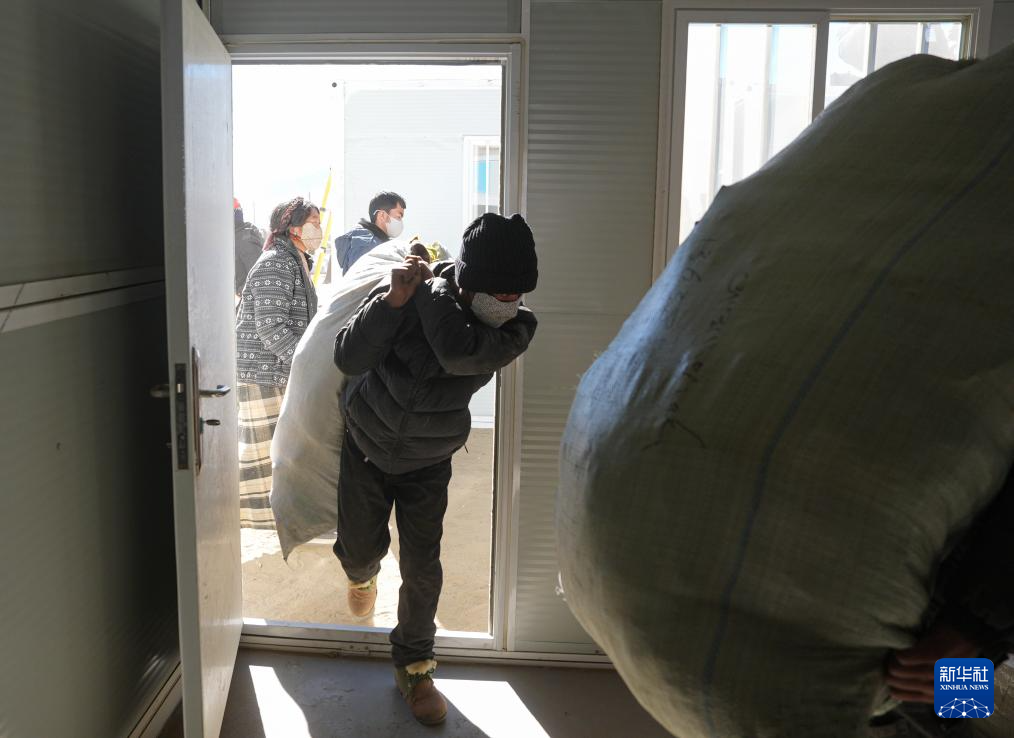 1月10日,在定日縣長所鄉(xiāng)古榮村,受災(zāi)群眾將領(lǐng)取到的過冬物資搬入板房。新華社記者 沈伯韓 攝