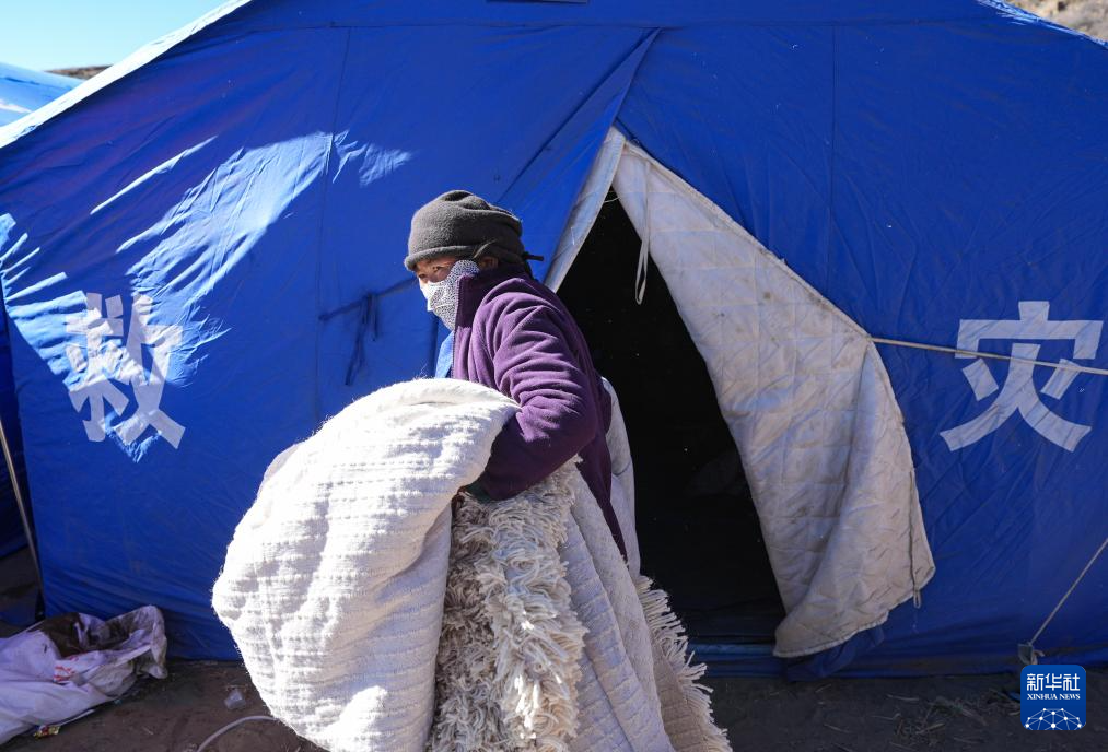 1月10日,在定日縣長所鄉(xiāng)古榮村,受災(zāi)群眾將過冬物資從臨時(shí)安置帳篷搬入板房。新華社記者 沈伯韓 攝