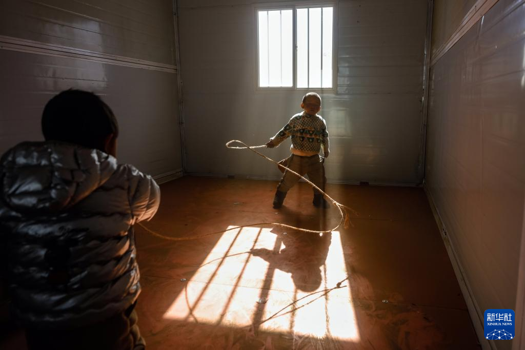 1月10日,在定日縣長所鄉(xiāng)古榮村,兩名小朋友在板房內(nèi)玩耍。新華社記者 沈伯韓 攝