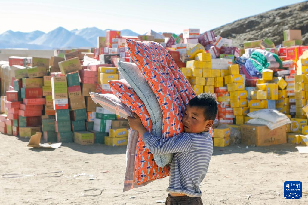 1月10日,在定日縣長所鄉(xiāng)古榮村,一名男孩抱著領(lǐng)取到的過冬物資,從臨時(shí)安置帳篷搬入板房。新華社記者 沈伯韓 攝