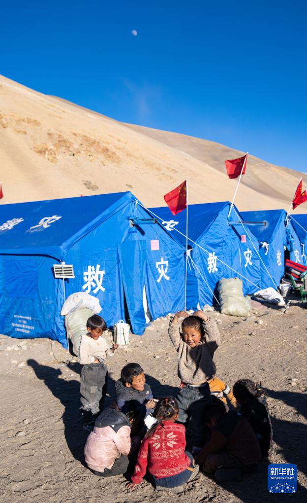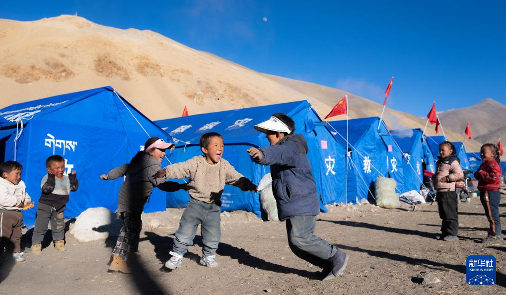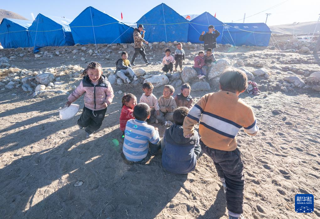 1月10日,在定結(jié)縣郭加鄉(xiāng)乃村安置點,孩子們在學(xué)生臨時學(xué)習(xí)區(qū)做游戲。新華社記者 丁增尼達 攝