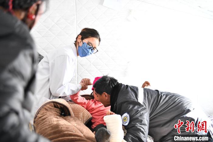 1月10日,西藏定日,醫(yī)護人員帶老人達娃的孫女去復查?!≈行律缬浾?貢嘎來松 攝