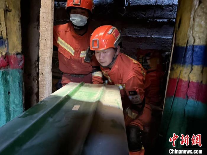 圖為日喀則市森林消防救援大隊(duì)隊(duì)員在受損房屋內(nèi)搜尋受災(zāi)村民財(cái)產(chǎn)。米瑪次仁 攝