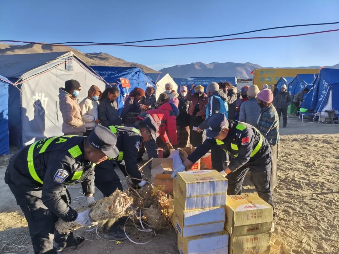 圖為在日喀則市定日縣長所鄉(xiāng)嘎布村安置點,日喀則邊境管理支隊嘎布村“帳篷警務(wù)室”民警幫助群眾卸載救災(zāi)物資。貢嘎齊平 攝