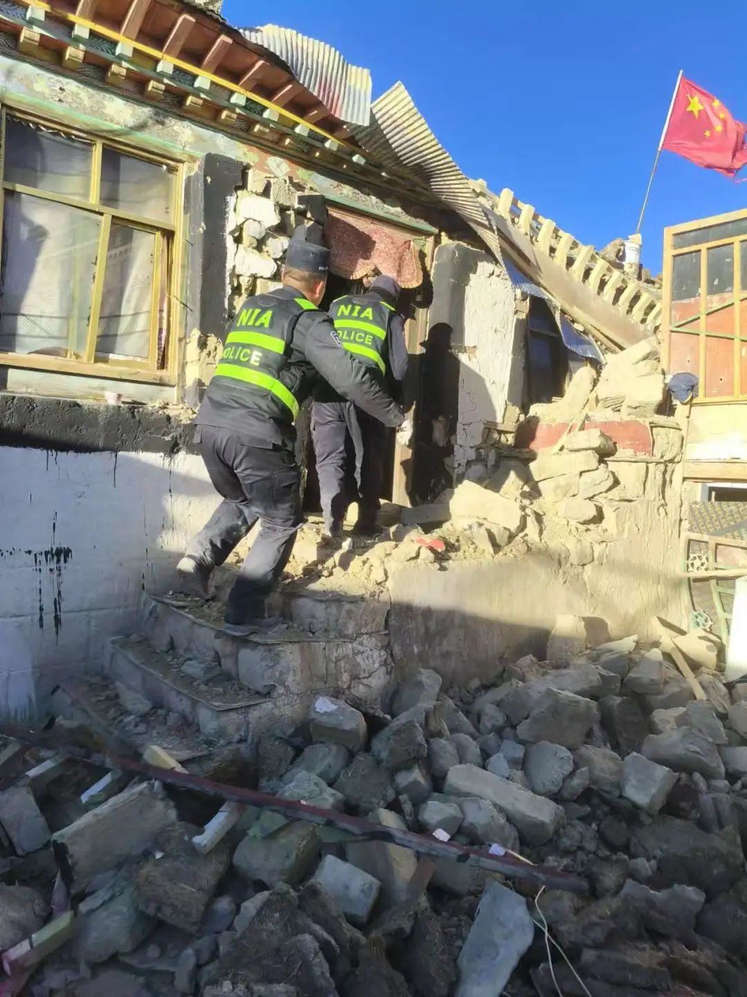 民警在得知情況后,第一時間了解次仁多布杰房屋的受災(zāi)情況,在確認(rèn)無二次坍塌情況下,請示上級領(lǐng)導(dǎo),經(jīng)同意后,協(xié)調(diào)雜村村委會、雜村安置區(qū)負(fù)責(zé)人員前往村民次仁多布杰家里幫助戶主搶救貴重財產(chǎn),18時39分,次仁多布杰屋內(nèi)貴重物品全部轉(zhuǎn)移完畢,救援民警才撤離現(xiàn)場。這仿佛在傳遞著一種無聲的力量:有我們在,別害怕。