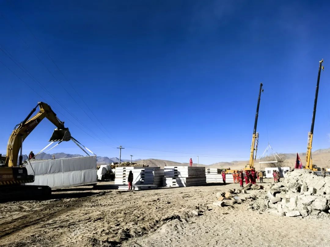 圖為在日喀則市定日縣長所鄉(xiāng)玉白村安置點,工作人員正在吊裝板房。平措塔杰 攝