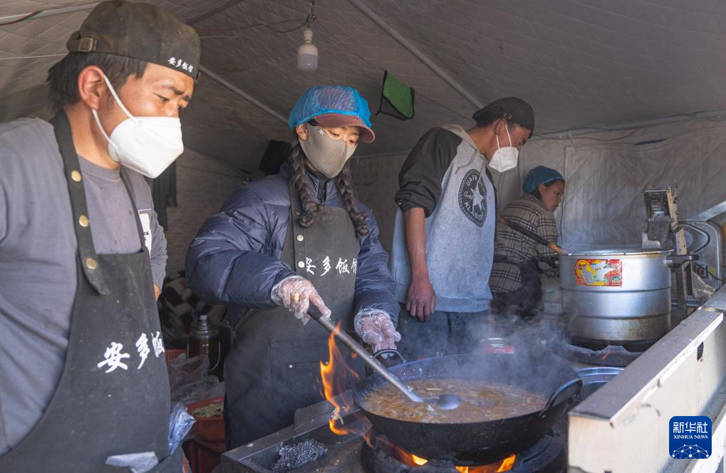 在定日縣長所鄉(xiāng)古榮村,定日安多飯館的廚師在為群眾做面片(1月13日攝)。新華社記者 丁增尼達(dá) 攝