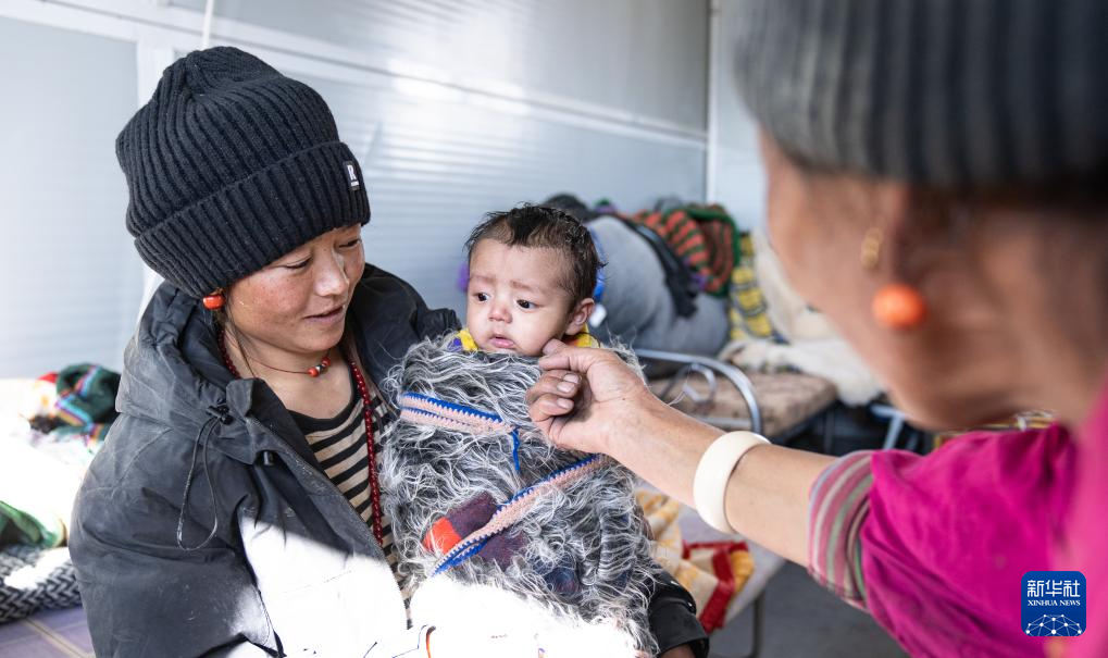 在定日縣長所鄉(xiāng)嘎旦村的活動(dòng)板房里,一位老人在逗孫子開心(1月13日攝)。新華社記者 丁增尼達(dá) 攝