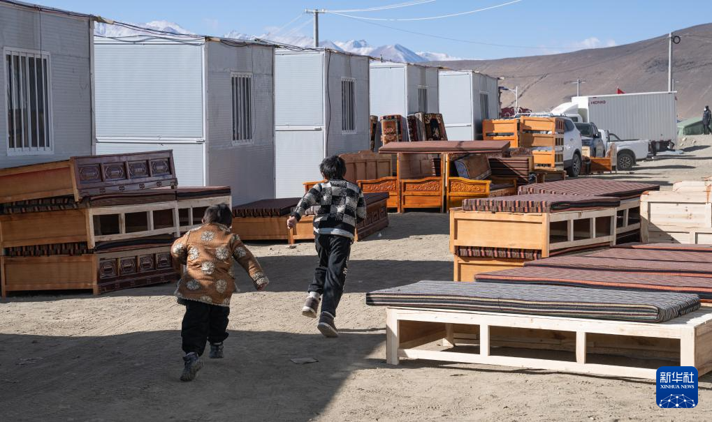 在定日縣長所鄉(xiāng)嘎旦村,兩個(gè)孩子在剛運(yùn)來的兩排藏床間奔跑(1月13日攝)。新華社記者 丁增尼達(dá) 攝