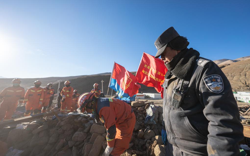 1月13日,在定日縣長所鄉(xiāng)古榮村,邊巴桑珠(右一)在指揮房屋廢墟清理工作。新華社記者丁增尼達 攝