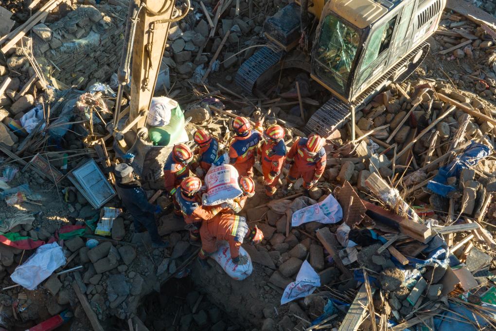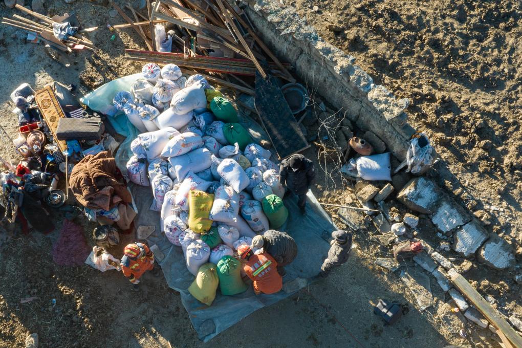 1月13日,在定日縣長所鄉(xiāng)古榮村,消防員們在整理從廢墟中搶救出的青稞(無人機照片)。新華社記者丁增尼達 攝