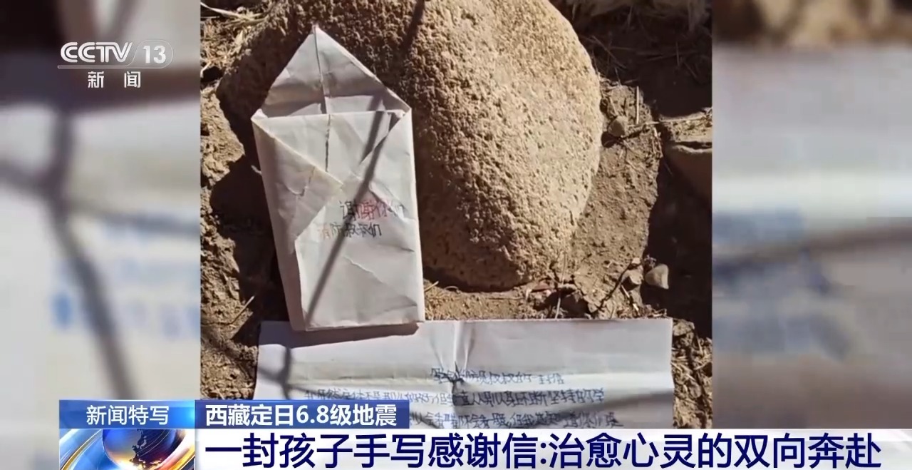 12日中午,消防員旦增赤列在曲洛鄉(xiāng)班久崗村安置點忙碌時,一個女孩突然將一個疊好的小紙包塞到他手里。裝信的紙包上寫著“謝謝你們,消防員叔叔”。