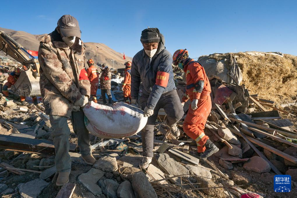 1月13日,在定日縣長所鄉(xiāng)古榮村,消防員們在搬運(yùn)從次仁扎西老人家里搶救出的青稞。新華社記者 丁增尼達(dá) 攝
