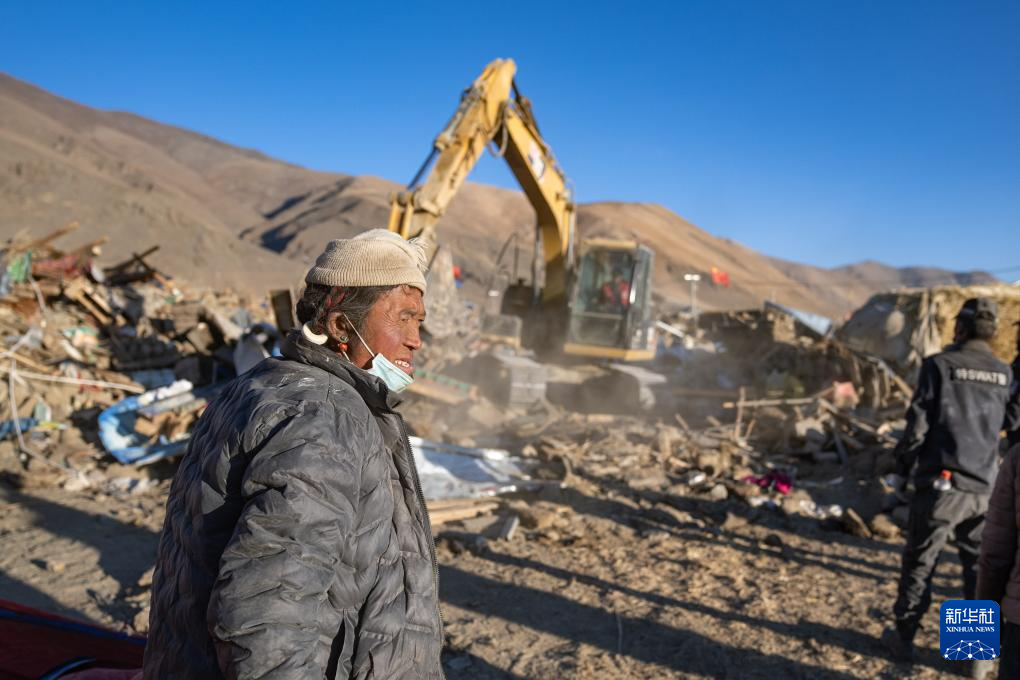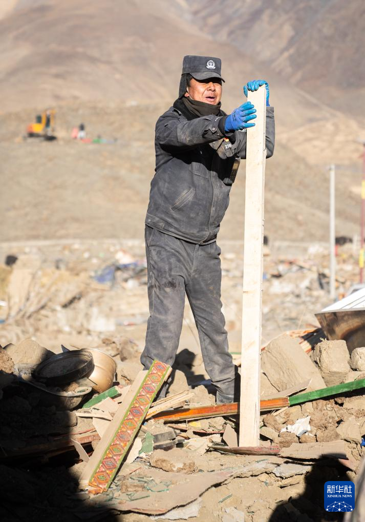 1月13日,在定日縣長所鄉(xiāng)古榮村,邊巴桑珠在指揮房屋廢墟清理工作。新華社記者 丁增尼達(dá) 攝