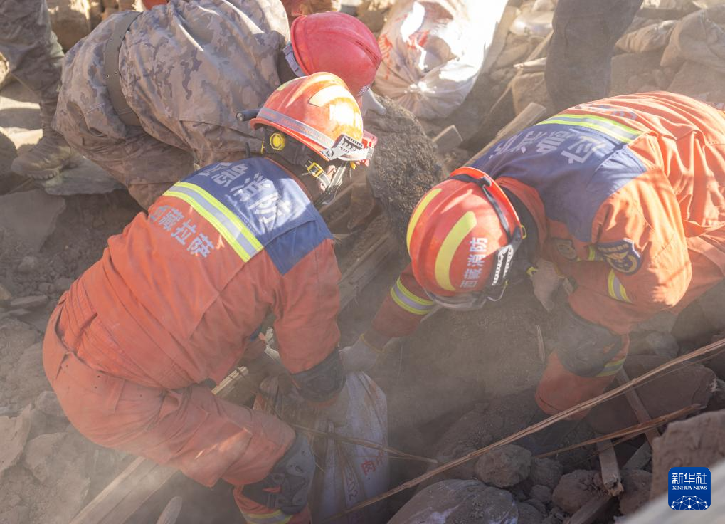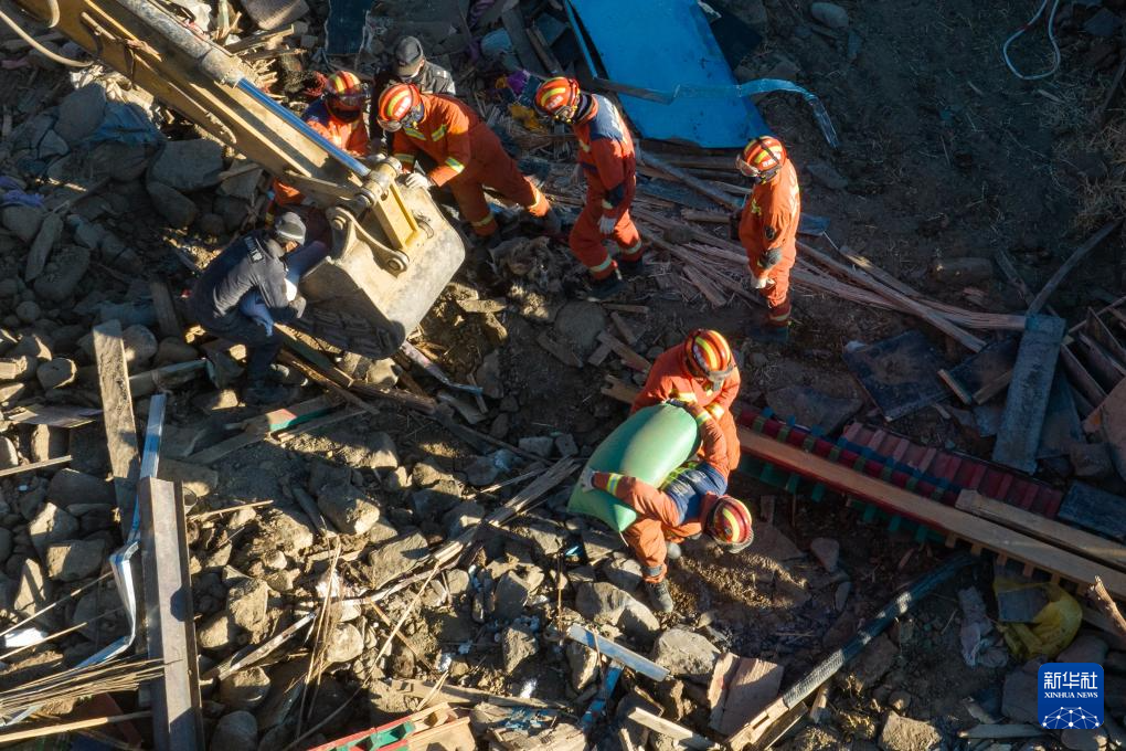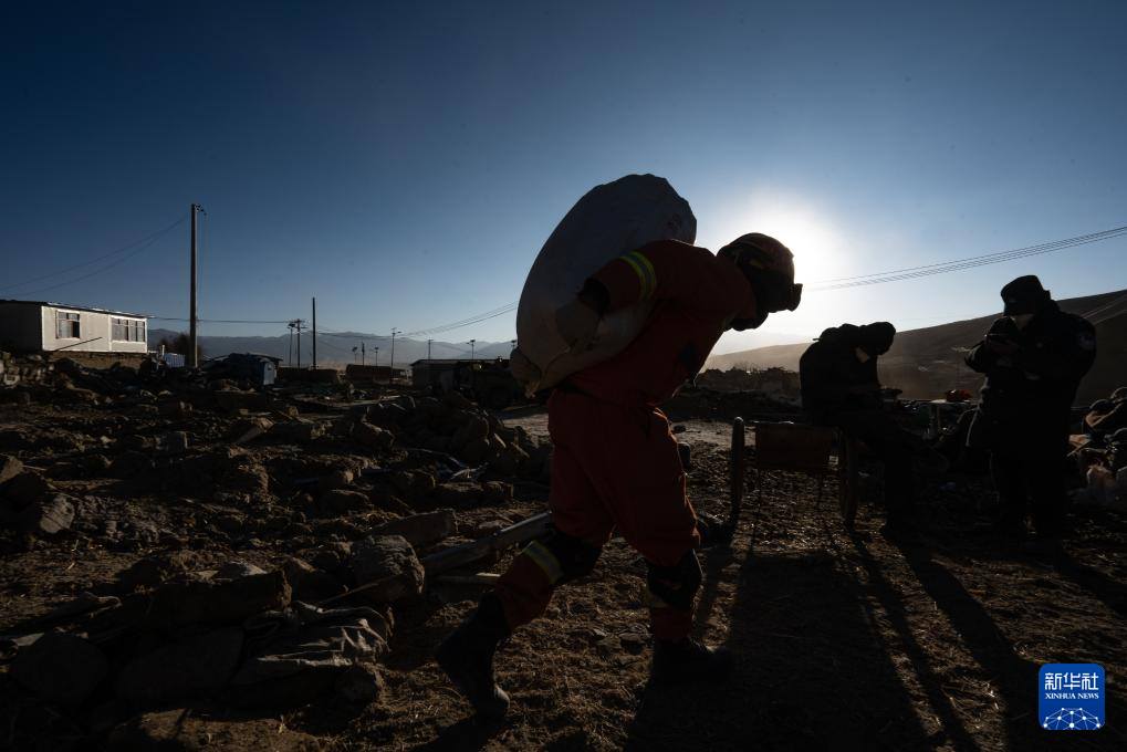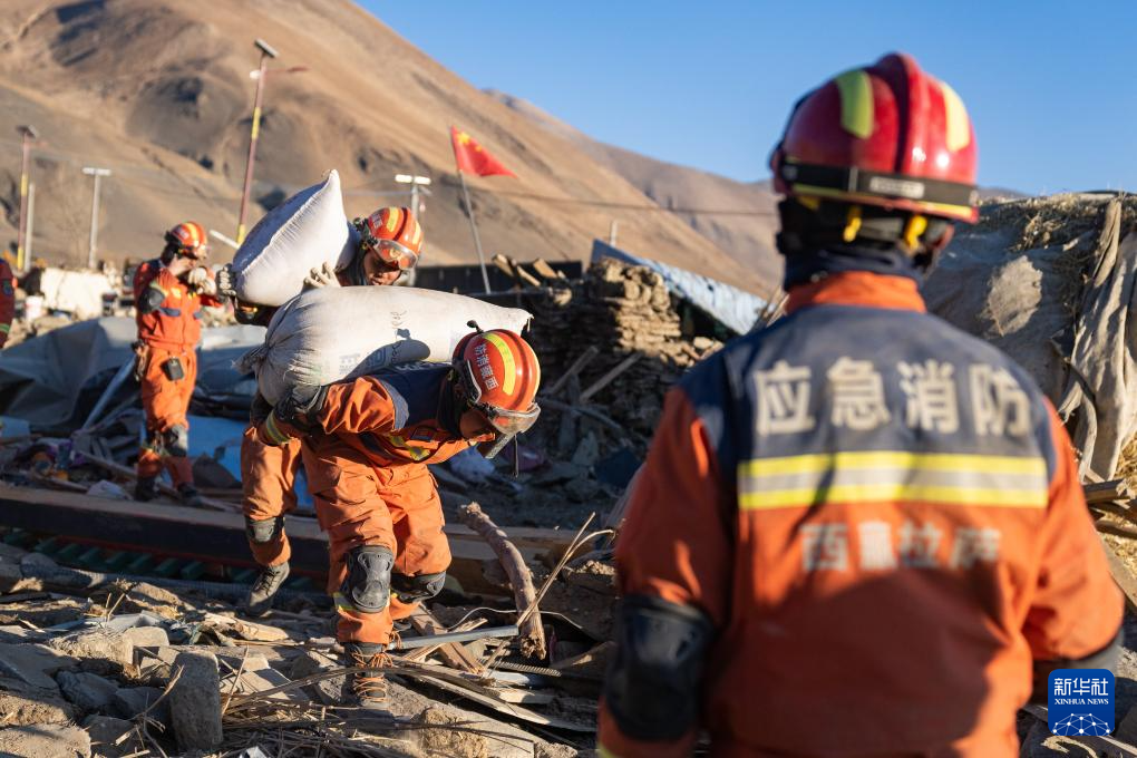 1月13日,在定日縣長所鄉(xiāng)古榮村,消防員在搬運(yùn)搶救出來的青稞。新華社記者 丁增尼達(dá) 攝