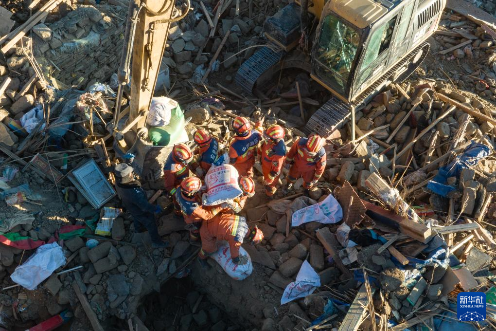 1月13日,在定日縣長所鄉(xiāng)古榮村,消防員、武警官兵和公安干警在搜尋次仁扎西老人家里的青稞。新華社記者 丁增尼達(dá) 攝