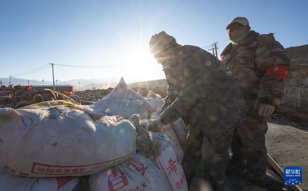 1月13日,在定日縣長所鄉(xiāng)古榮村,定日縣民兵在搬運(yùn)青稞。新華社記者 丁增尼達(dá) 攝