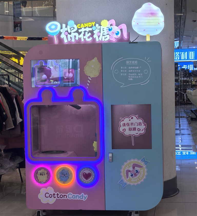 除了自助游戲機(jī),自助棉花糖機(jī)也是一大亮點(diǎn)。在拉薩市多家大型商超內(nèi),自助棉花糖機(jī)成為了孩子們的新寵。記者走訪發(fā)現(xiàn),目前拉薩各大商場(chǎng)內(nèi)的棉花糖機(jī)大多為同一品牌,機(jī)子中的棉花糖有42種,一個(gè)棉花糖售價(jià)19.9元。市民可以根據(jù)口味、顏色、造型選擇棉花糖,操作流程也十分便捷,選購后掃碼支付即可。