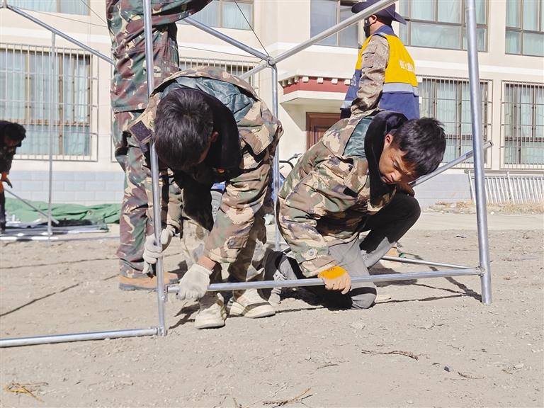 來自日喀則市江孜縣的次仁加措,雖然年僅23歲,眼神中透露出一種不容置疑的堅定。他一邊熟練地搭著帳篷,一邊說:“我們是軍人,哪怕退伍了,這份責(zé)任也永遠在肩上。”一旁,普瓊達瓦正在卸載著救援物資,汗水從他的額頭滑落到塵土中。次仁旺加和邊巴扎西則在一旁協(xié)助搭建帳篷。他們的雙手早已磨出了紅印,但手中的活卻一刻也沒有停下。