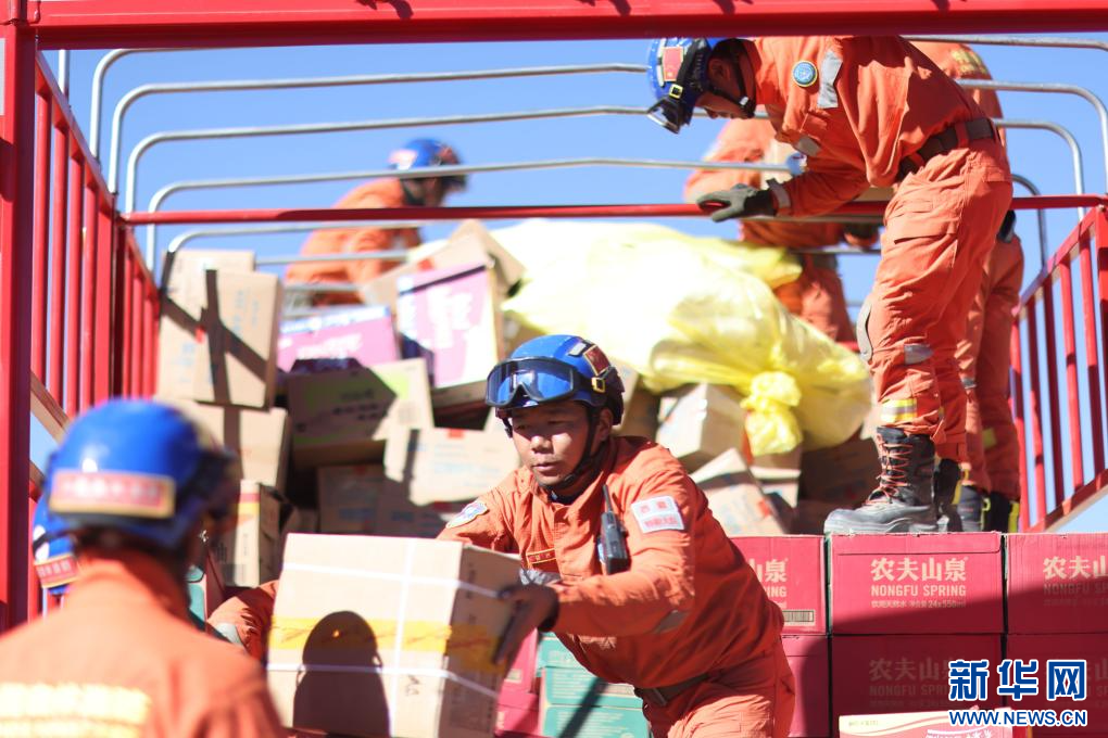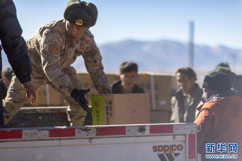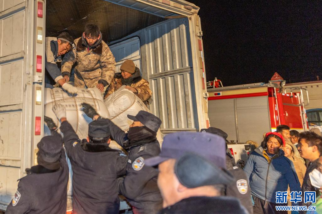 1月9日,救援人員在拉孜縣拉孜鎮(zhèn)措布村卸載救災物資。新華社記者 姜帆 攝