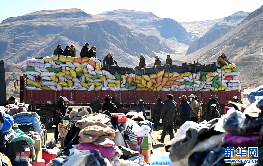 1月10日,在定日縣一處救災物資集中存放點,志愿者在合力搬運救援物資。新華社記者 晉美多吉 攝