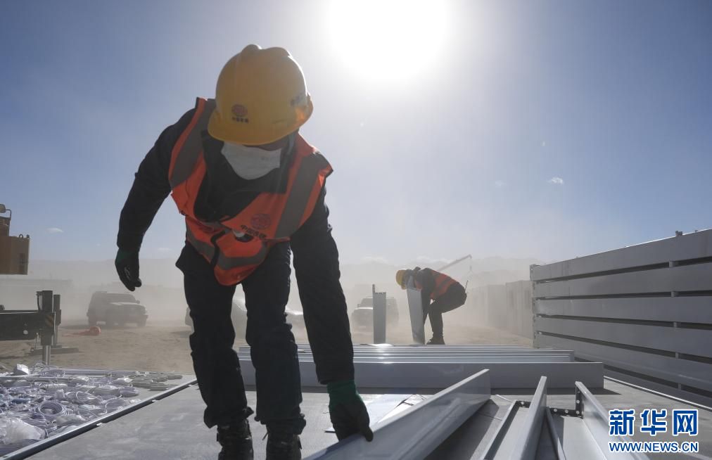 1月9日,中鐵二十局施工人員頂著風沙在長所鄉(xiāng)森嘎村安裝活動板房 。新華社記者 晉美多吉 攝