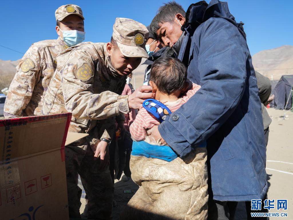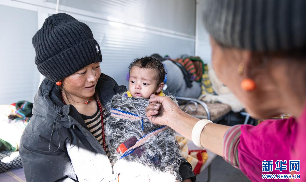 1月8日,在長所鄉(xiāng)森嘎村臨時安置點,西藏軍區(qū)總醫(yī)院醫(yī)療隊隊員為小朋友治療。 新華社記者 丁汀 攝