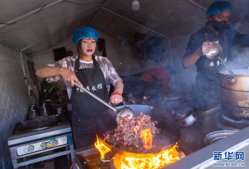 在定日縣長所鄉(xiāng)古榮村,定日縣安多飯館的吉瓊在為安置點的群眾做晚飯(1月15日攝)。新華社記者 丁增尼達 攝