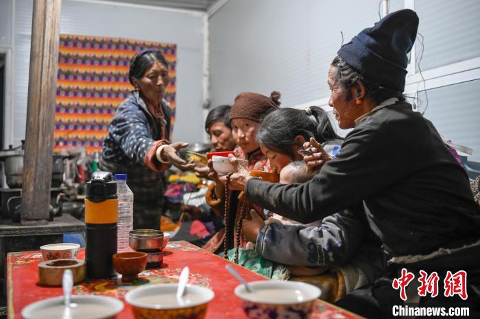 “今年我們家的‘古突’(一種藏式面食)里有面疙瘩、牛肉、蕨麻、奶渣、米飯,很香、很好吃?!?月28日是農(nóng)歷春節(jié)除夕,恰逢日喀則農(nóng)事新年“古突夜”,在西藏定日縣曲洛鄉(xiāng)措昂村安置板房?jī)?nèi),20歲的央宗喝完一碗母親煮的“古突”后對(duì)中新社記者說(shuō)。