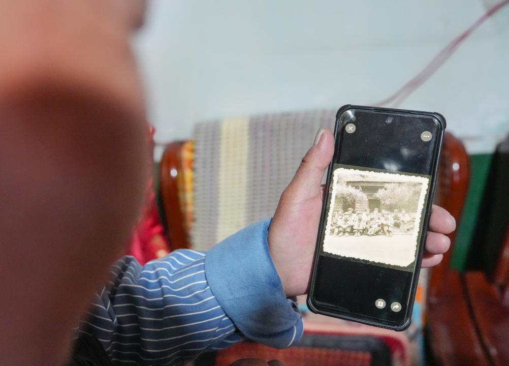 1月29日,孫建學(xué)翻看手機(jī)上留存的年輕時修路的照片。新華社記者 晉美多吉 攝