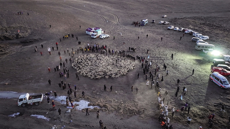 兩名牧羊人牽著威風(fēng)凜凜的牧羊犬,和其他牧羊人分別守在羊群兩側(cè),時(shí)刻維持著隊(duì)伍的秩序。隨著時(shí)間推移,原本泛紫的天空漸漸被日出的光輝染成絢麗的紅色,霞光輕柔地灑在湖邊連綿起伏的雪山上,為雪山勾勒出一圈溫柔的金色輪廓。冰湖上,羊群與牧羊人的身影在晨光的映照下被無(wú)限拉長(zhǎng),宛如一幅徐徐展開(kāi)的古老畫(huà)卷,靜謐而美好。