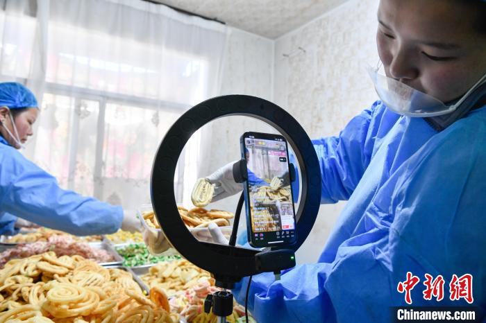 2月10日,西藏拉薩市林廓北路一家卡塞店里,工人在直播賣卡塞。“卡塞”是一種油炸面食,是藏歷新年必不可少的食物。隨著藏歷新年的日益臨近,古城拉薩各個(gè)加工銷售“卡塞”的店鋪飄出陣陣香味。中新社記者 貢嘎來松 攝