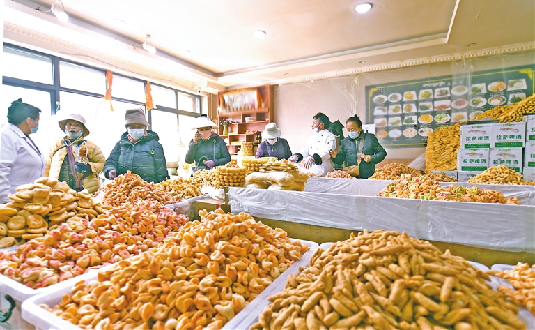 隨著藏歷新年日益臨近,拉薩街頭巷尾各種琳瑯滿目的“藏式”年貨,讓年味兒越來越濃,而構(gòu)成這年味兒最重要的元素之一就是“卡賽”的香味兒?!翱ㄙ悺笔且环N油炸面食,是藏歷新年必不可少的食物。藏歷新年前夕,古城拉薩各個(gè)加工銷售“卡賽”的店鋪飄出陣陣香味。