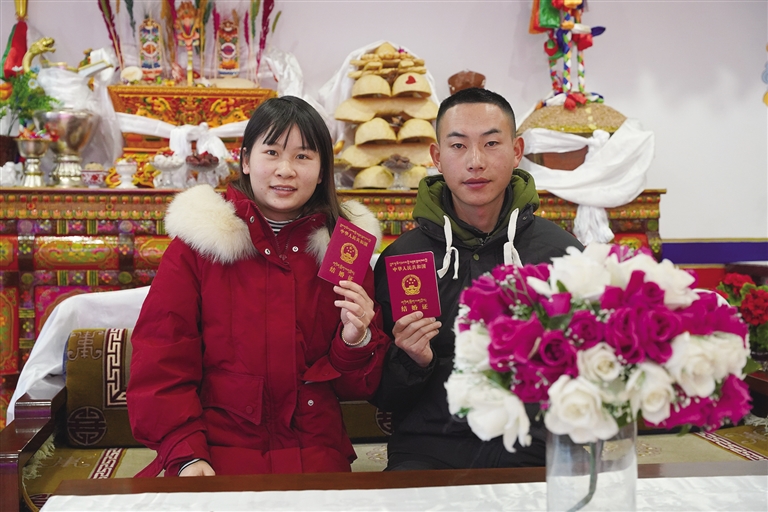 “我們?cè)谝黄?年了,是表姐牽的紅線?!钡┰龈峦吣樕涎笠缰腋5男θ?,緩緩說道,“初次見到卓嘎,我就對(duì)她心生好感。相處一段時(shí)間后,我發(fā)現(xiàn)她性格溫柔,和我特別合拍,于是鼓起勇氣向她表白?!彼_心地展示著剛剛領(lǐng)到的結(jié)婚證,“情人節(jié)是個(gè)好日子,我們?cè)缇陀?jì)劃好今天領(lǐng)證,現(xiàn)在終于如愿以償。以后情人節(jié)和結(jié)婚紀(jì)念日合二為一,既能少買一份禮物,也不用擔(dān)心忘記啦?!?/p>