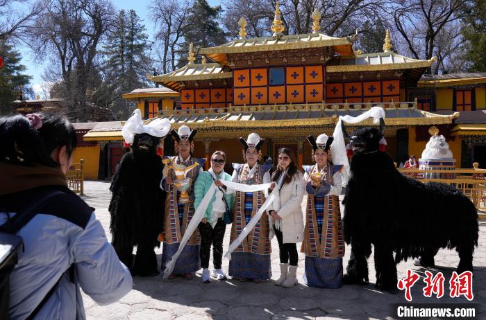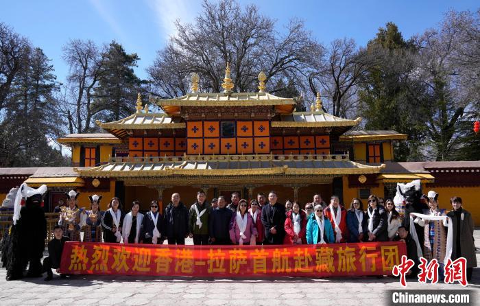 圖為歡迎儀式現(xiàn)場,香港游客在羅布林卡與身著拉薩傳統(tǒng)服飾的工作人員合影留念。中新社記者 李林 攝