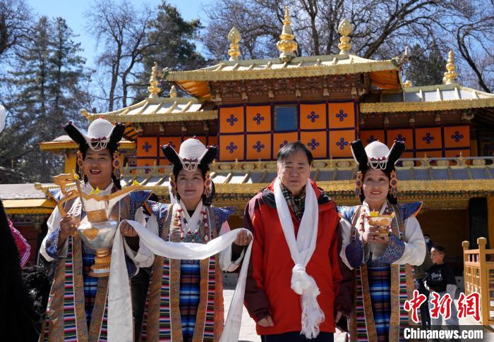 圖為歡迎儀式現(xiàn)場,香港游客在羅布林卡與工作人員合影留念。中新社記者 李林 攝